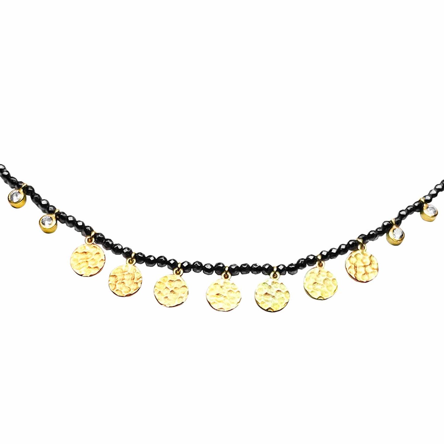 Exclusive Yakamoz Karma necklace. This necklace has small black crystal beads and rhodium yellow gold plated silver hammered coins with cz droplets.